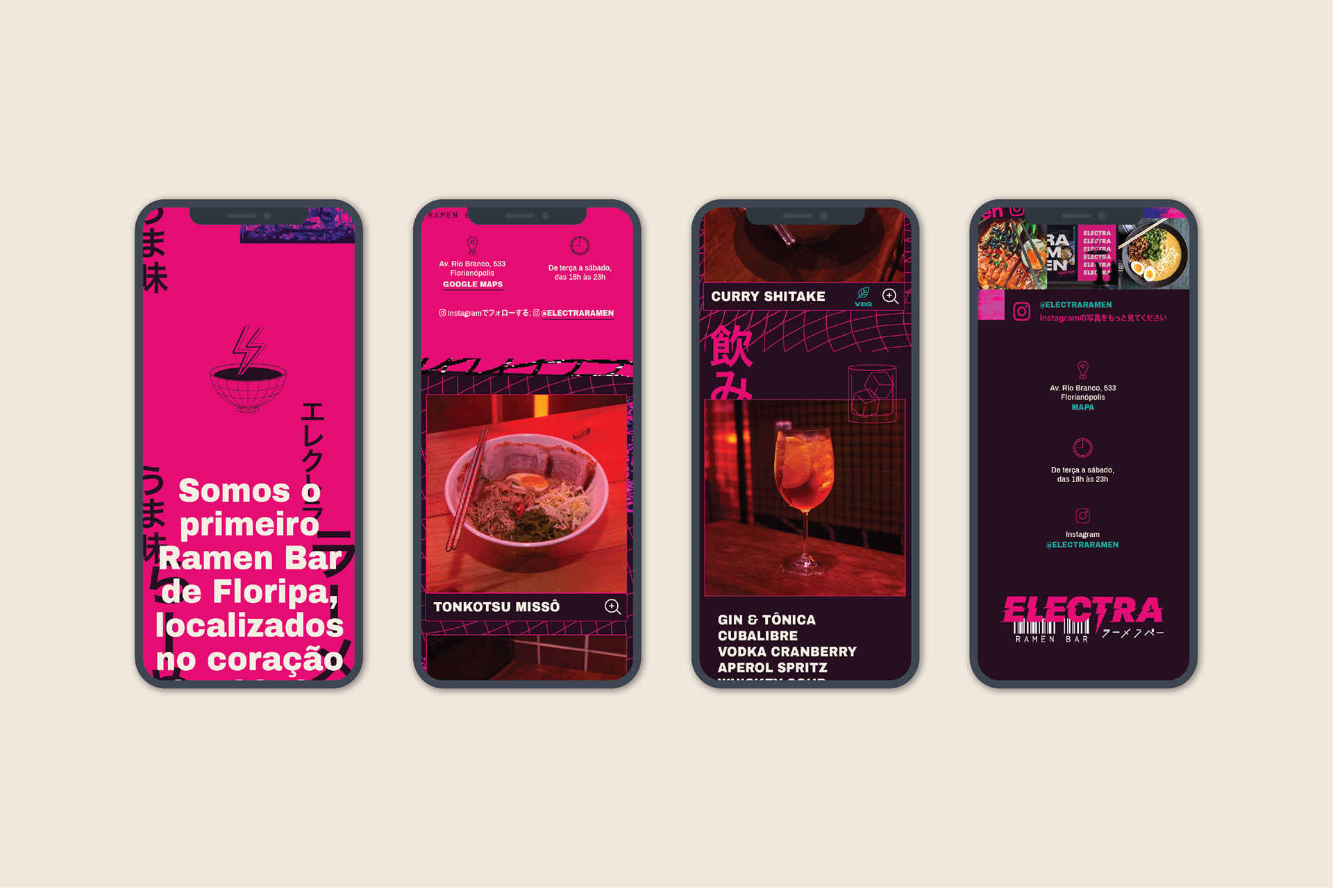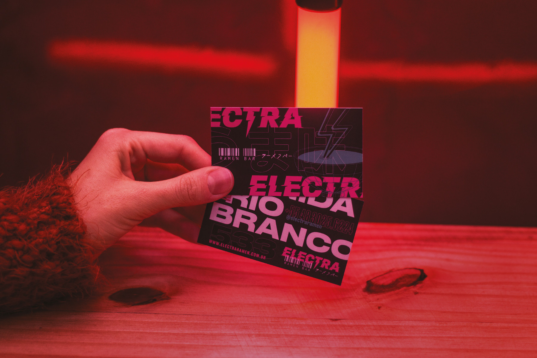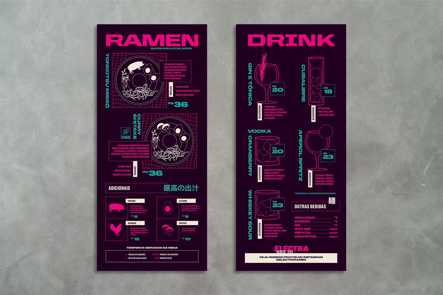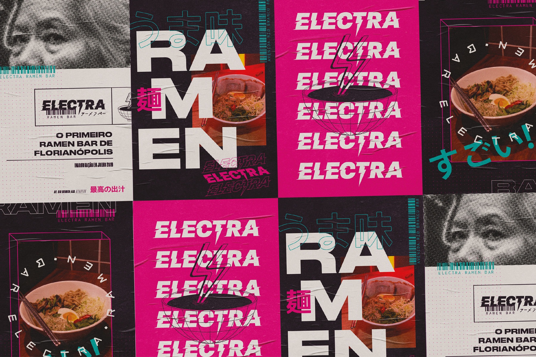 Naming, branding, identity, signage. Electra is a trendy ramen bar located in Florianópolis, a tropical island on the south of Brazil. Our main goal was to create something away from the tradicional Japanese cuisine as the chef is a Brazilian who loves and study the oriental culinary but doesn't have any family or direct connection with Japan. The briefing was to imagine the place as a cyber punk hideout for the "mafia" were the big boss was a Japanese young woman. We partnered with Emanuella Wojcikiewicz Architects to created cyber punk atmosphere with a lot of neon lights and electricity flowing all over the place. From that we created an ocidental name exploring this concept and branding materials bringing the neon colors and the super busy aesthetic of Japanese streets. Role: Creative director / Designer