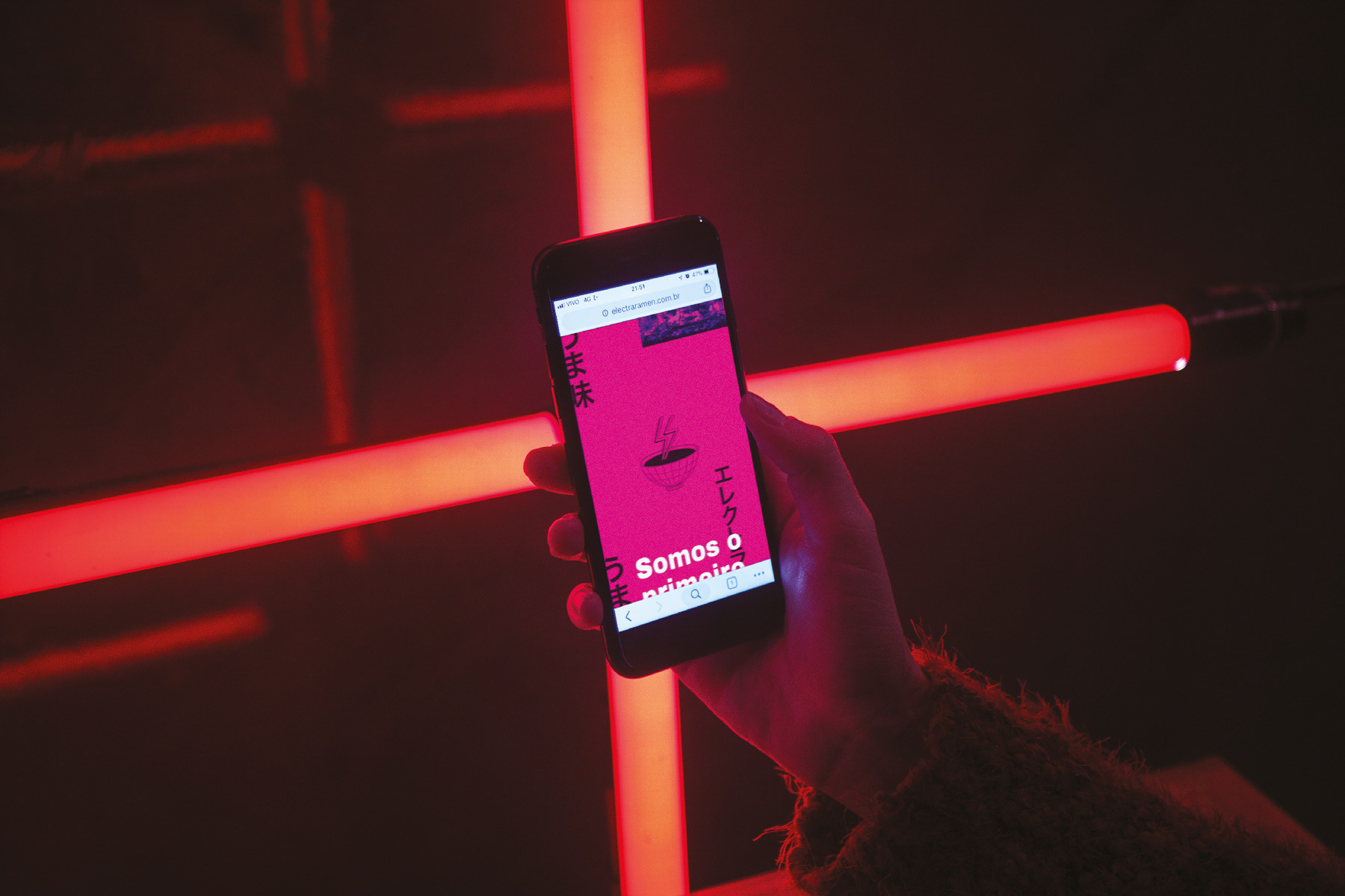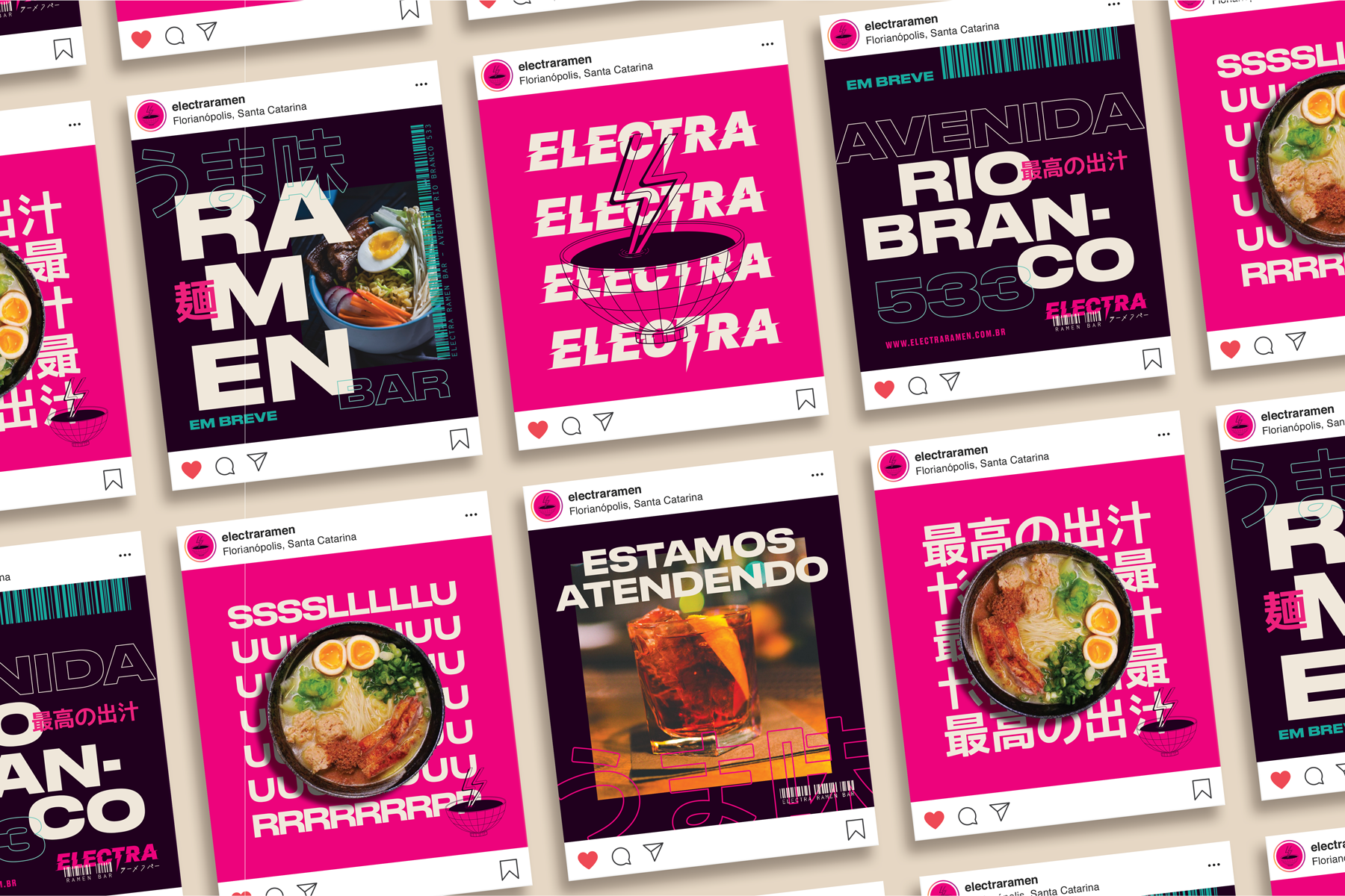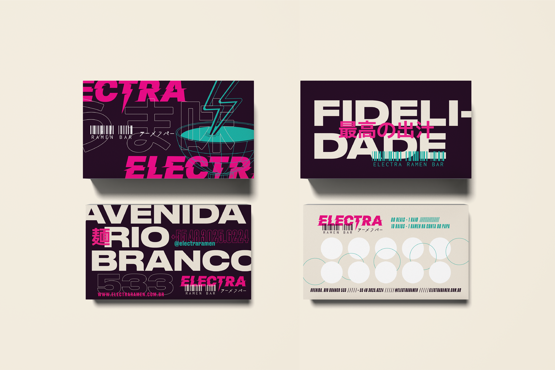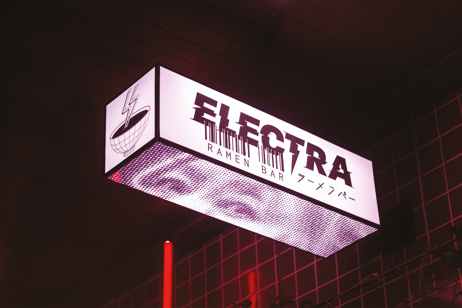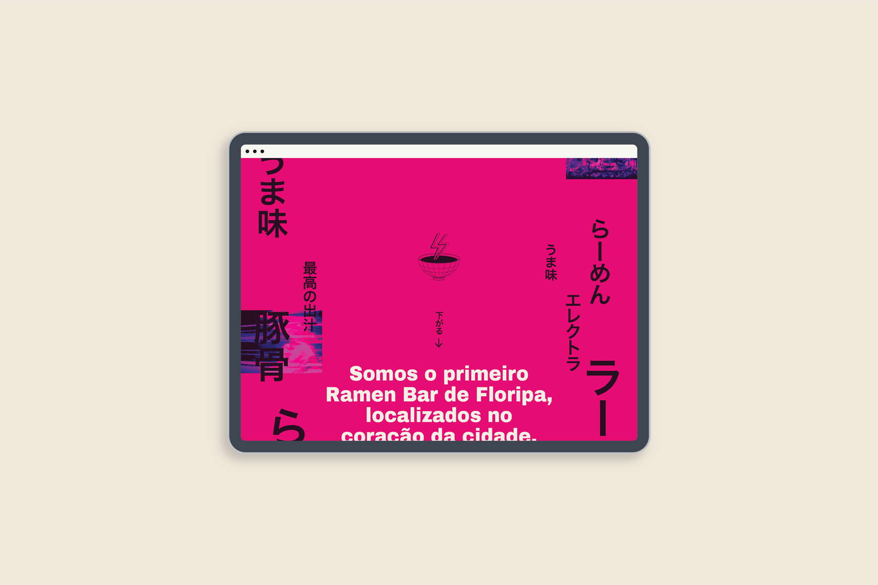 Naming, branding, identity, signage. Electra is a trendy ramen bar located in Florianópolis, a tropical island on the south of Brazil. Our main goal was to create something away from the tradicional Japanese cuisine as the chef is a Brazilian who loves and study the oriental culinary but doesn't have any family or direct connection with Japan. The briefing was to imagine the place as a cyber punk hideout for the "mafia" were the big boss was a Japanese young woman. We partnered with Emanuella Wojcikiewicz Architects to created cyber punk atmosphere with a lot of neon lights and electricity flowing all over the place. From that we created an ocidental name exploring this concept and branding materials bringing the neon colors and the super busy aesthetic of Japanese streets. Role: Creative director / Designer