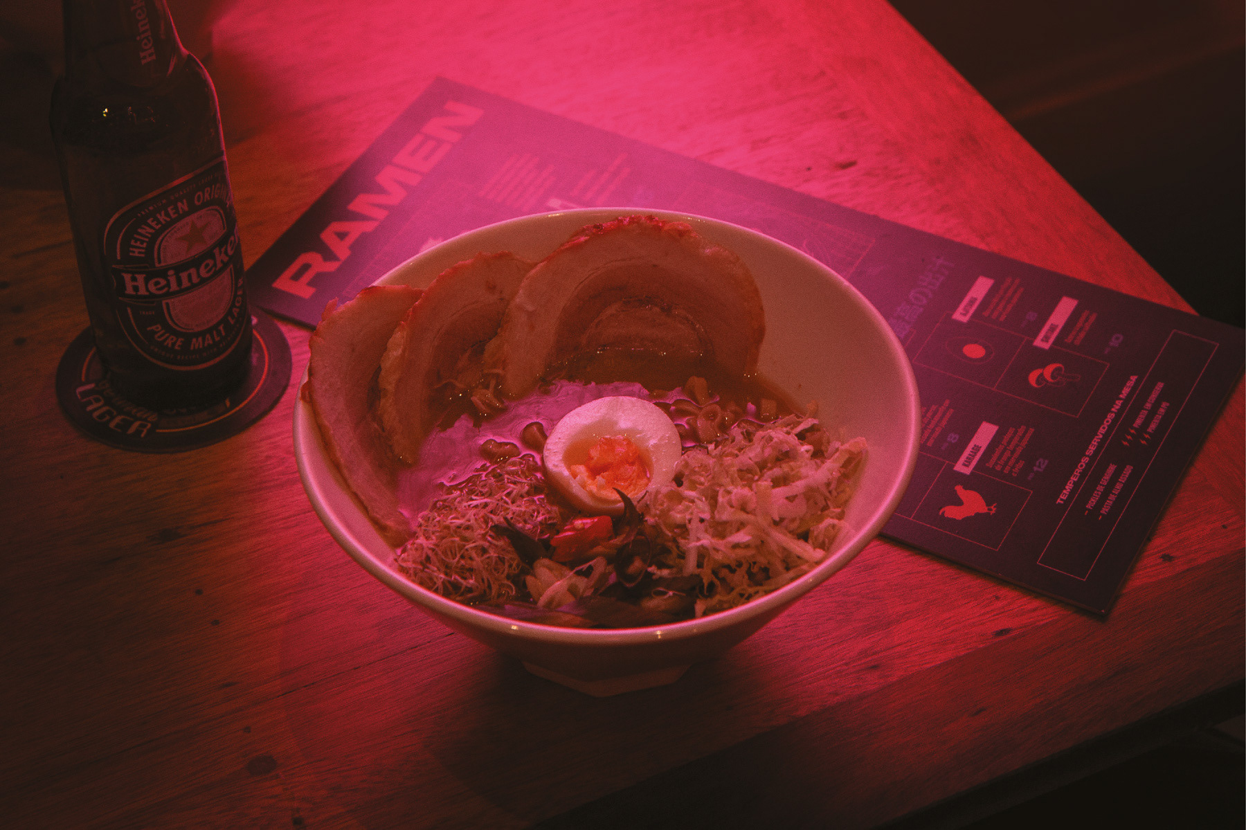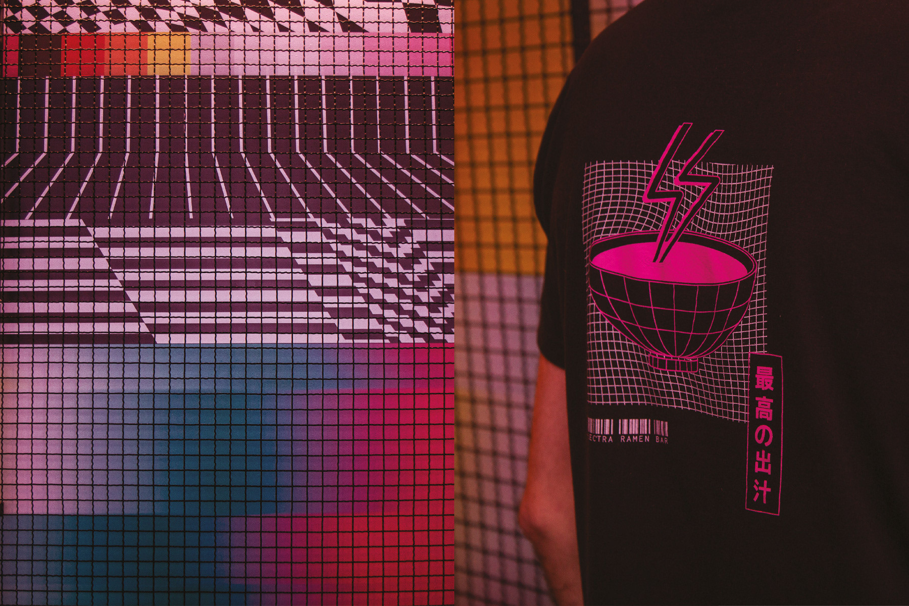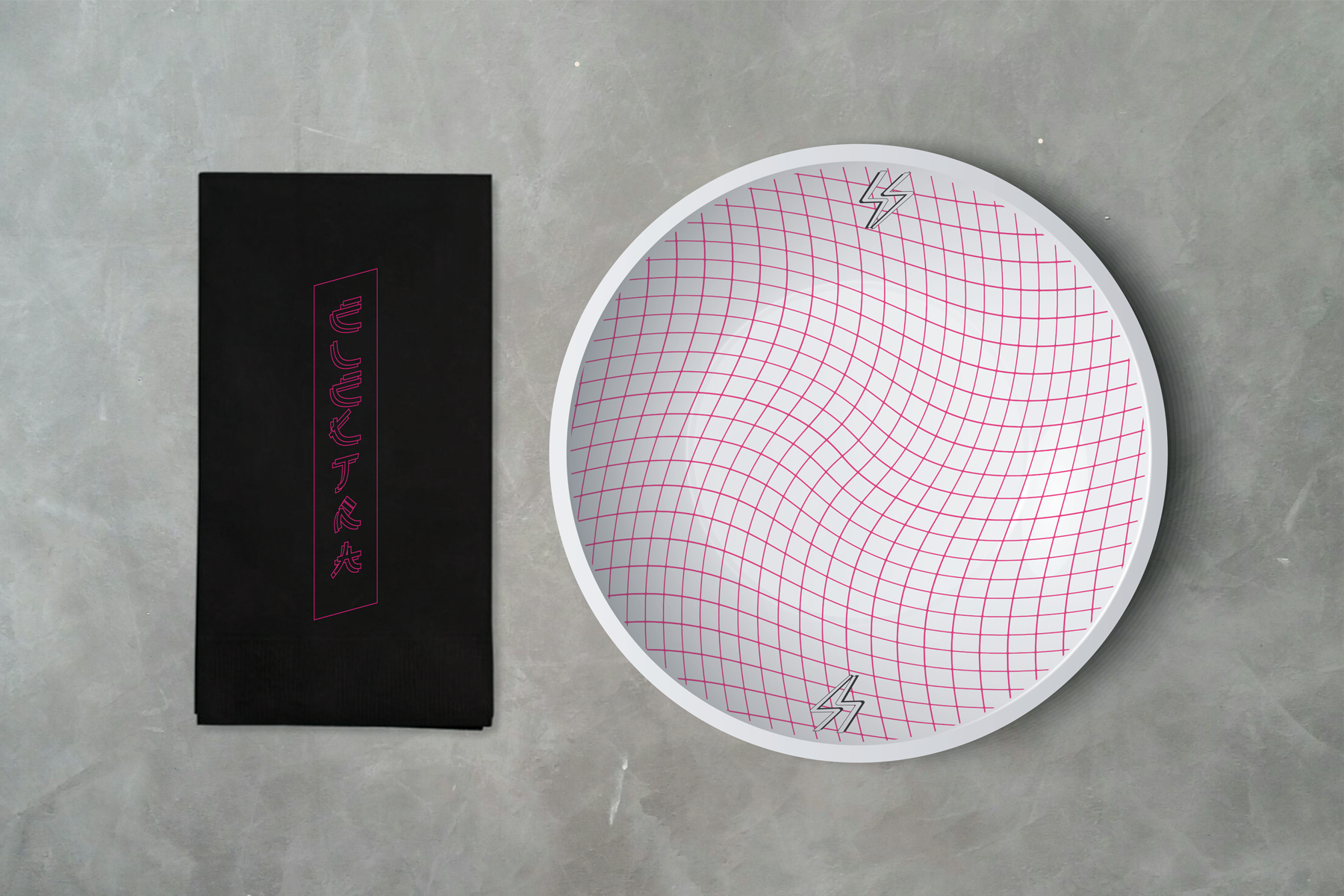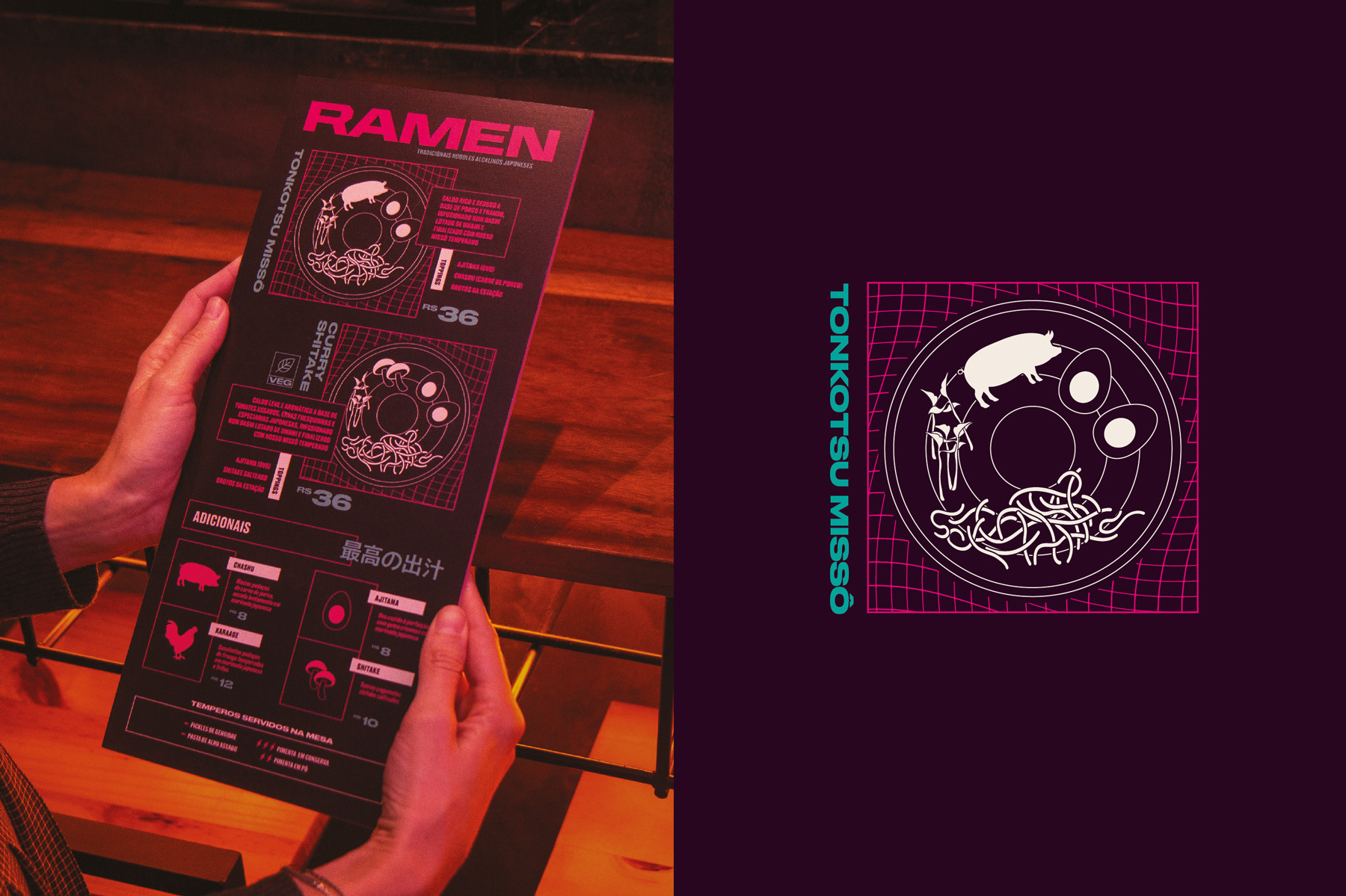 Naming, branding, identity, signage. Electra is a trendy ramen bar located in Florianópolis, a tropical island on the south of Brazil. Our main goal was to create something away from the tradicional Japanese cuisine as the chef is a Brazilian who loves and study the oriental culinary but doesn't have any family or direct connection with Japan. The briefing was to imagine the place as a cyber punk hideout for the "mafia" were the big boss was a Japanese young woman. We partnered with Emanuella Wojcikiewicz Architects to created cyber punk atmosphere with a lot of neon lights and electricity flowing all over the place. From that we created an ocidental name exploring this concept and branding materials bringing the neon colors and the super busy aesthetic of Japanese streets. Role: Creative director / Designer